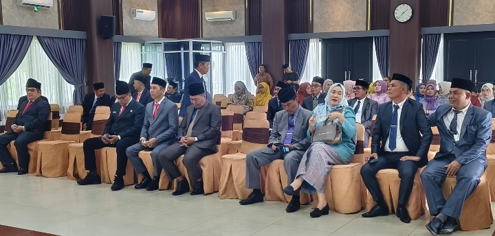 Para pejabat terlihat mengenakan setelan jas lengkap dengan peci hitam, sementara pejabat perempuan tampil anggun dengan busana resmi. Mereka duduk rapi menunggu prosesi pelantikan yang dijadwalkan berlangsung sekitar pukul 14.00WIB.
